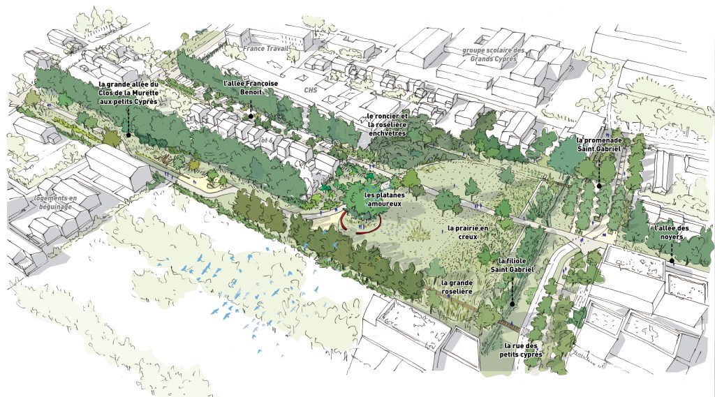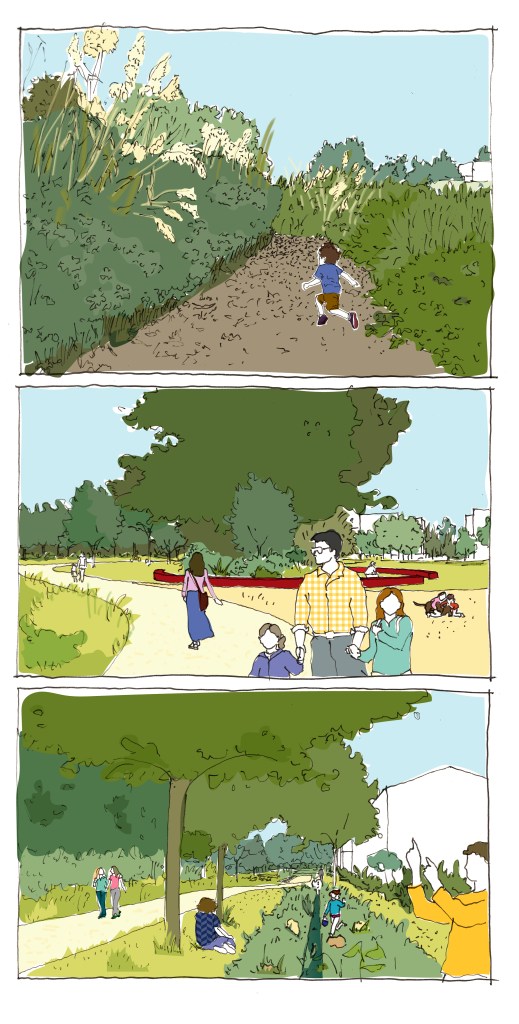 - une approche qui vise à la création d’un paysage habité avec l’aménagement d’un grand dispositif paysager, une trame verte centrale qui s’étire d’est en ouest